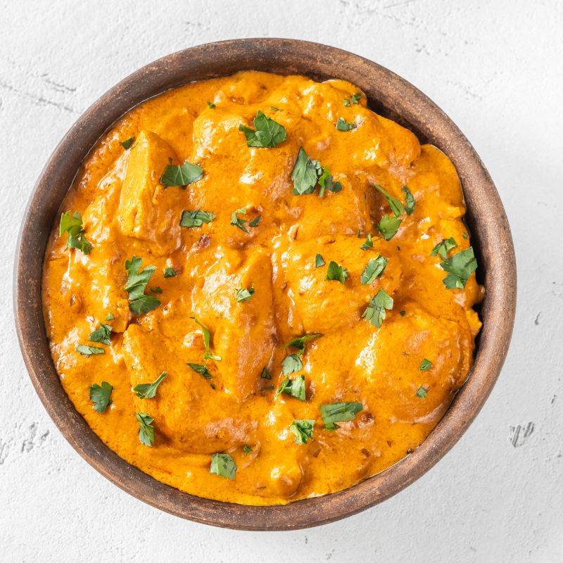 Tikka Masalasoße, gegrilletes Hähnchen, Paprika, Zwiebeln, Knoblauch, Ingwer, Koriander